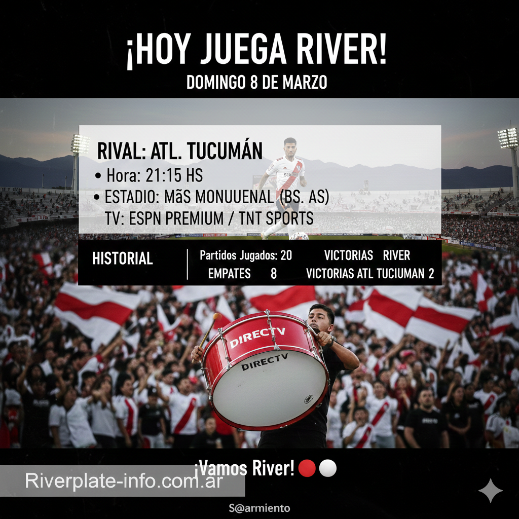 Tras el empate en Mendoza, el «Millonario» se prepara para recibir al «Decano» por la fecha 9 del Torneo Apertura 2026. Será una noche especial: Eduardo Coudet tendrá su estreno oficial en el banco de suplentes ante un estadio que promete estar colmado. River Plate busca reencontrarse con la victoria y acortar distancias con el pelotón de arriba. El equipo llega con el impulso anímico de la llegada de un referente como el Chacho Coudet, quien tuvo apenas unos días de trabajo pero ya empieza a plasmar su idea de juego intenso y ofensivo. 📅 ¿Cuándo, dónde y cómo verlo? Día: Domingo 8 de marzo de 2026. Hora: 21:15 HS. Estadio: Mâs Monumental (Buenos Aires). Árbitro: A designar. TV: ESPN Premium / TNT Sports (Se requiere tener contratado el Pack Fútbol). Streaming: Flow, Telecentro Play o DGO (sintonizando los canales del pack fútbol). 📊 Historial y Estadísticas: River Plate vs. Atlético Tucumán El duelo ante el conjunto tucumano se ha convertido en un cruce recurrente y siempre complicado en los últimos años. Las estadísticas oficiales marcan un claro predominio del Más Grande, aunque con muchos empates recientes: Historial General: Jugaron 20 partidos en la era profesional. Victorias River: 10 Victorias Atl. Tucumán: 2 Empates: 8 Goles: River marcó 26 tantos, mientras que el Decano anotó 17. Dato Clave: Atlético Tucumán solo pudo vencer a River en 2 oportunidades en toda su historia oficial, pero los últimos 5 enfrentamientos han sido extremadamente parejos, con una gran cantidad de igualdades (3 de los últimos 6 terminaron en empate). Último antecedente en el Monumental: River se impuso con autoridad, buscando siempre el protagonismo que la historia del club exige. 📝 El posible 11 para el debut Aunque Coudet no confirmó el equipo, se espera que mantenga la base que empató en Mendoza, pero con un sistema más agresivo. La única duda pasa por la evolución de Martínez Quarta tras su choque de cabezas; si no llega, su lugar sería ocupado por Paulo Diaz. Navegación de entradas River rescató un empate en Mendoza en el inicio de la era post-Gallardo 🚨 ÚLTIMO MOMENTO: Se postergó el partido ante Atlético Tucumán